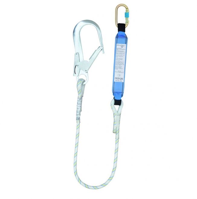 Absorbedor de cuerda semiestática con un mosquetón de acero cierre rosca y un mosquetón de aluminio abertura 60 mm. Opcionalmente disponible con mosquetón de aluminio automático. Longitud total 152 cm