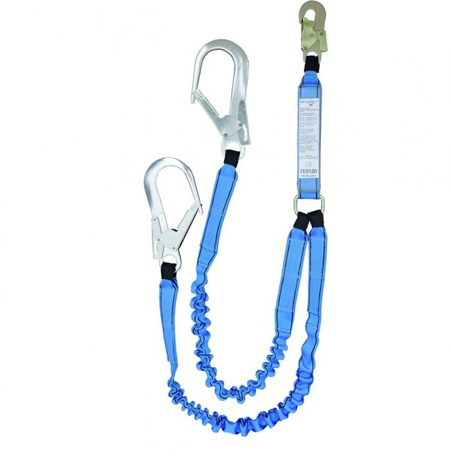Absorbedor elástico bifurcado con mosquetón de acero automático y dos mosquetones de aluminio de abertura 60 mm.