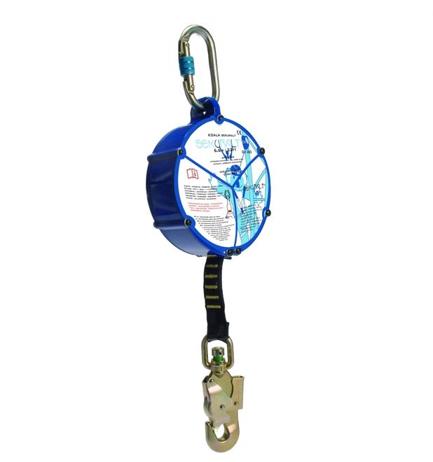 Anticaídas de reposición automática de cinta de nylon, longitud 3,3 m, cárter aluminio. Incluye un mosquetón giratorio automático con indicador de caída Ref. 986 y mosquetón acero Ref. 981