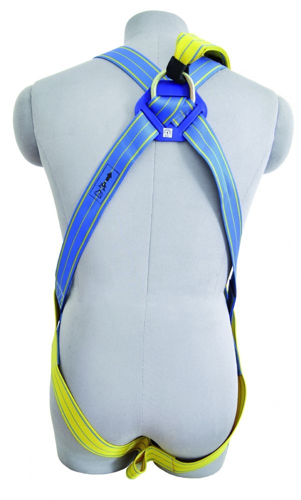 Arnés a dos colores con un punto de anclaje dorsal y cinta de extensión. Regulable en muslos, cinta pectoral y cinta pélvica.