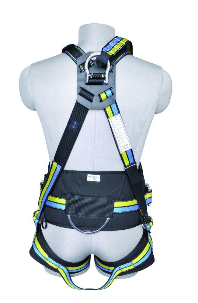 Arnés con un punto de anclaje dorsal y cinta de extensión, un punto de anclaje esternal, cinturón de posicionamiento giratorio 180º con dos anillas "D" laterales y anillas porta-herramientas. Regulable en hombros y muslos. Cinta pectoral, cinta elástica en hombros, cinta pélvica y perneras acolchadas. Hebillas de cierre rápido automático. Anillas de aluminio forjado. Incluye bolsa de nylon.