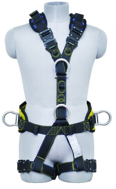 Arnés con un punto de anclaje dorsal, un punto de anclaje esternal, una anilla "D" ventral para asiento y dos anillas de anclaje "D" laterales para posicionamiento. Cintas regulables en hombros, muslos y pecho. Las hebillas de las perneras son automáticas y proporcionan un fácil ajuste. Dos anillas mas un soporte porta-herramientas. Dispone de una malla tejida especialmente acolchada en poliéster que ofrece mejor absorción de energía y proporciona el máximo confort al usuario. Anillas en aluminio forjado. Incluye bolsa de nylon.