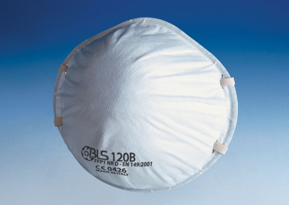 Mascarilla BLS 120BW FFP1 NR D para partículas inertes. Carbonato cálcico, magnesio, cemento, maderas blandas. Presentación en caja de 20 unidades. Precio unitario: 0,65 €