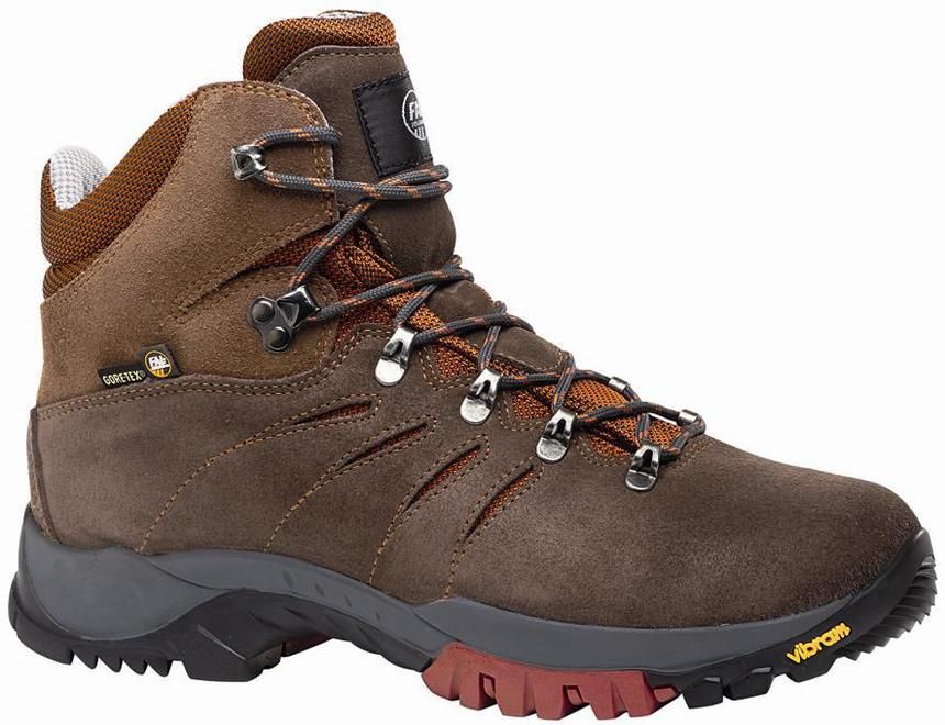 Bota de montaña. Piel de serraje hidrofugado color marrón. Forro interior Gore-Tex ®. Cuello y lengüeta de cordura hidrofugada. Montada sobre palmilla Texon con culote y cambrillón. Piso de caucho Vibram®. Plantilla interior de poliéster punzonada. Cierre de ganchos metálicos y cordón.