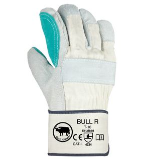 Guante de cuero vacuno serraje crupón gris y lona blanca, con refuerzo verde en palma, pulgar e índice. Longitud 27 cm, talla única 10, grosor 1.1 mm. Presentación en bolsas de 12 pares. Precio unitario del par de guantes 2.59 €.