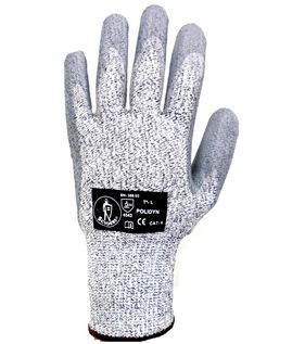Guante sin costuras con soporte HPPE y fibra de vidrio. Recubierto de poliuretano negro en palma y uñeros. Galga 13. Corte 5. Disponible en varias tallas.