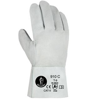 Guante de serraje crupón gris, sin forro. Talla única 9, con disponibilidad de dos tallas de manguito, corto (8 cm) y largo (14 cm). Grosor 1 mm. Presentación en bolsas de 12 unidades. Precio unitario del par 2.19 (corto) y 2.49 € (largo).