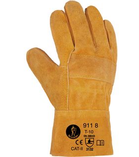 Guante de serraje vacuno marrón. Elástico interior de ajuste en la muñeca. Talla única 9, con disponibilidad de dos tallas de manguito, corto (8 cm) y largo (14 cm). Grosor de 1.2 mm. Presentación en bolsas de 12 unidades. Precio unitario del par 2.35 (corto) y 2.41 € (largo).