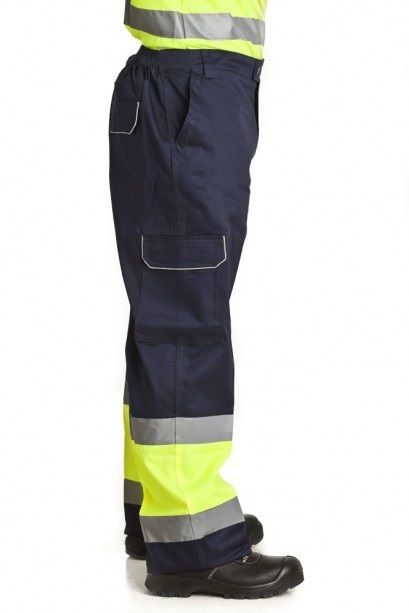 Pantalón bicolor de alta visibilidad, media cintura elástica, sin pinzas, bolsos con tapeta y clebro uno de ellos lateral y reflectantes