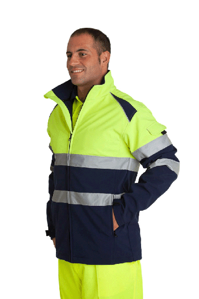 Softshell bicolor  alta visibilidad, cremallera central, bolsillos, uno en manga, bajo ajustado, reflectante.